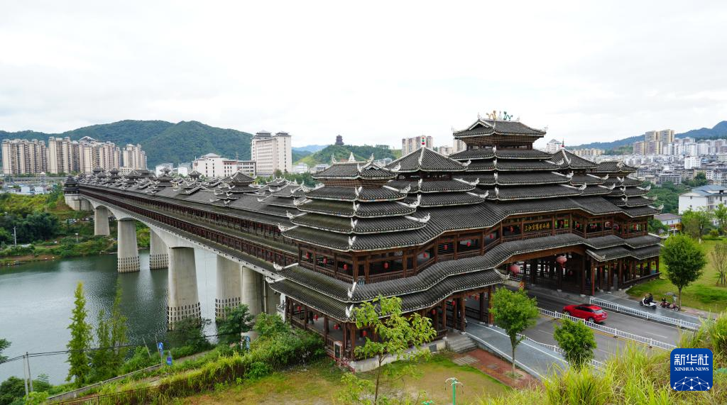 这是9月25日拍摄的三江侗族自治县的程阳永济桥。该桥建成于1924年,整座桥梁搭建时不用一钉一铆,主要由木料和石料建成,桥长近80米,宽近4米,高近12米,是我国建筑艺术中的珍品。