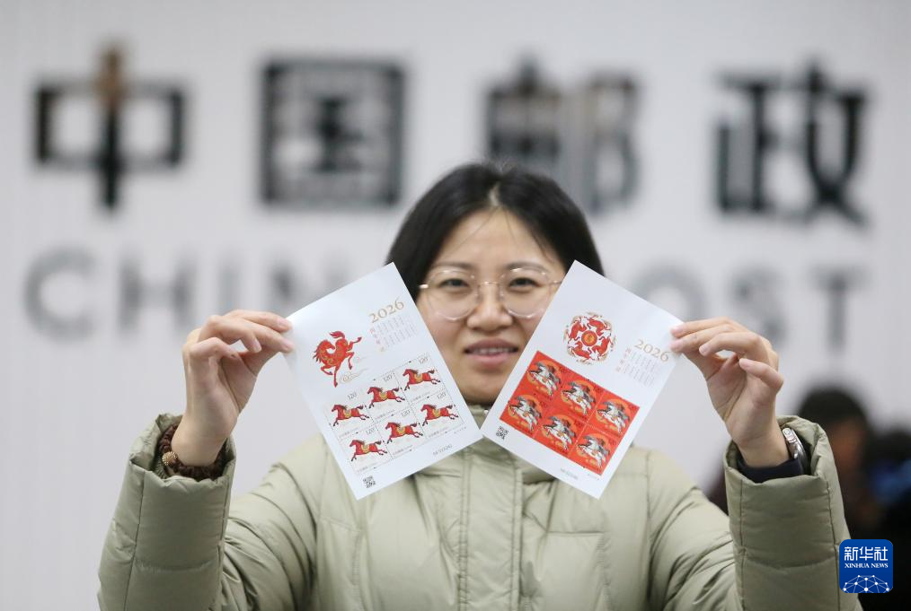1月5日,在安徽安庆市一邮政网点,工作人员展示《丙午年》特种邮票。
