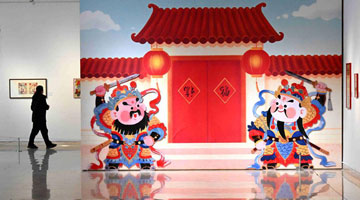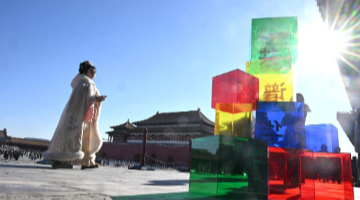 1月4日,游人在西安城墙上观赏“长安灯会”的巨型花灯。