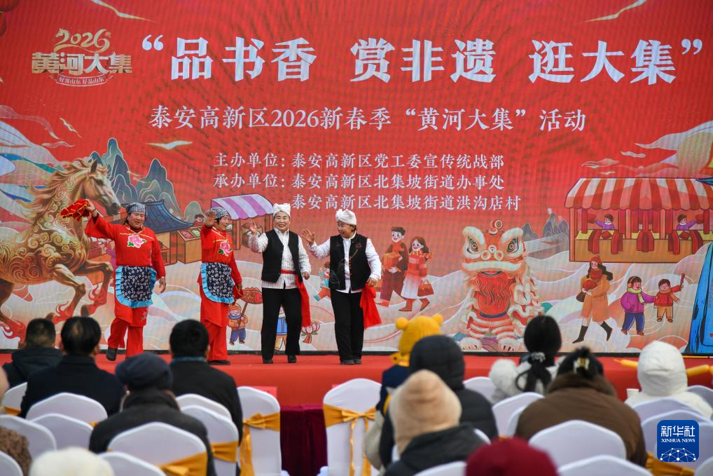 1月30日,山东省泰安市高新区北集坡街道组织的“品书香 赏非遗 逛大集”活动热闹开集,丰富多彩的文艺节目和便民服务项目吸引周边村镇居民前来逛大集办年货。