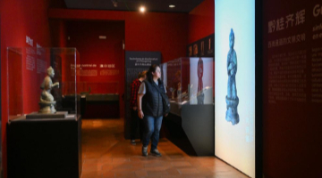 曾锐在展示家族前辈创作的雕塑瓷作品(3月12日摄)。