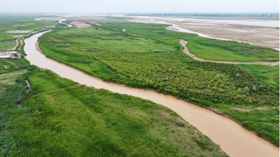 新华社照片,银川,2025年6月22日 在宁夏平罗县境内拍摄的黄河滩涂湿地(无人机照片)。新华社记者 王鹏 摄