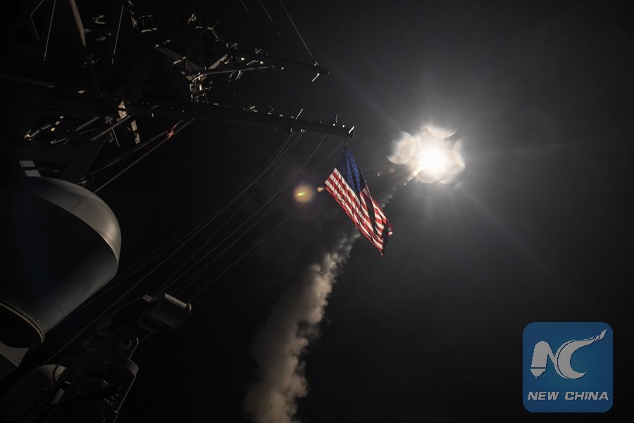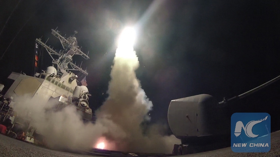 In this handout photo provided by the U.S. Navy, U.S. navy guided-missile destroyer USS Porter fires a tomahawk land attack missile in the Mediterranean Sea, April 7, 2017. A total of 59 Tomahawk Land Attack missiles were launched from the destroyers USS Porter and USS Ross in the Eastern Mediterranean Sea at about 8:40 p.m. EDT on April 6 (4:40 a.m. on Friday in Syria), and Syrian aircraft, hardened aircraft shelters, fuel points, air defense systems, and radars were targeted, according to a Pentagon statement. (Xinhua/U.S. Navy)