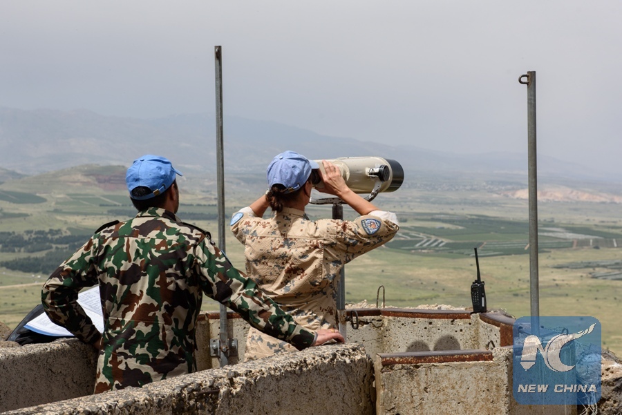 A member of the United Nations Disengagement Observer Force looks through binoculars at an observation post on the Israeli-occupied Golan Heights, on May 10, 2018. (Xinhua/JINI/Ayal Margolin)
