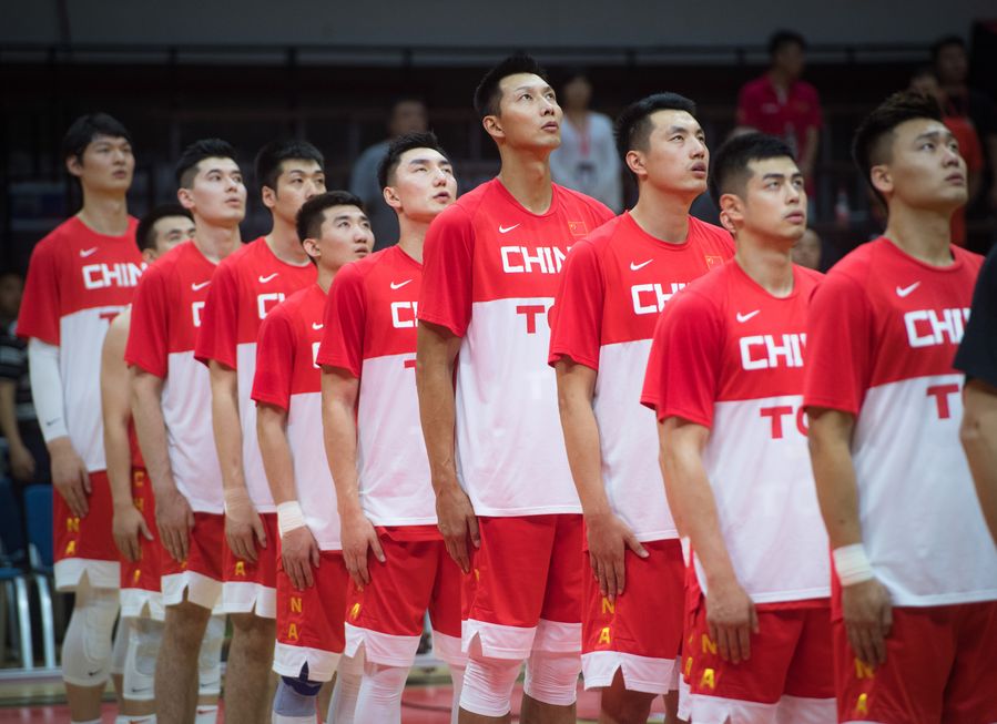 The players of Team China sing the national anthem at the opening ceremony before the world cup warm-up game against Brazil. (Xinhua/Xiao Yijiu)