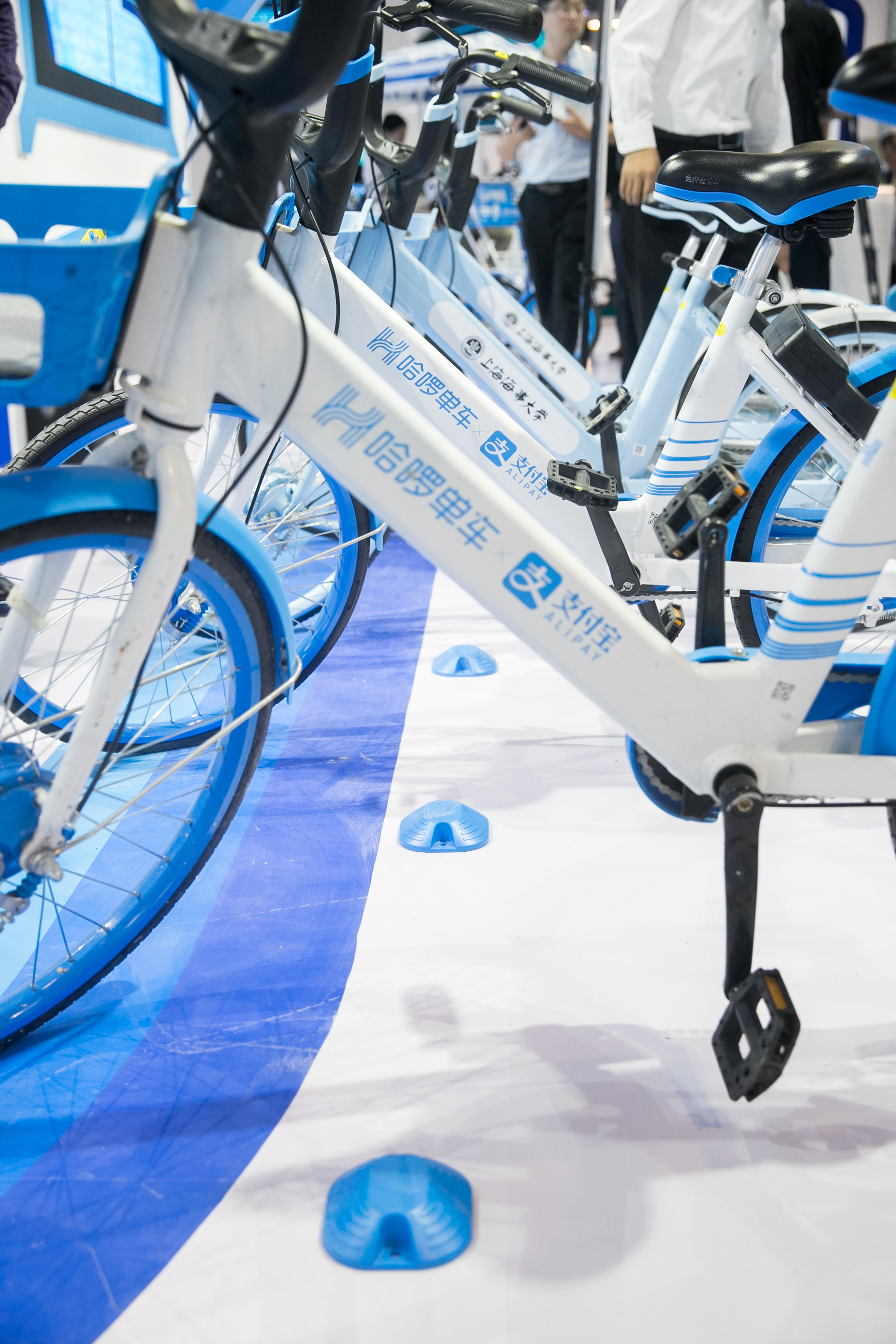 Bluetooth devices that assist with the parking of shared bikes, during the 2019 World Artificial Intelligence Conference (WAIC) in east China's Shanghai. (Xinhua/Ding Ting)
