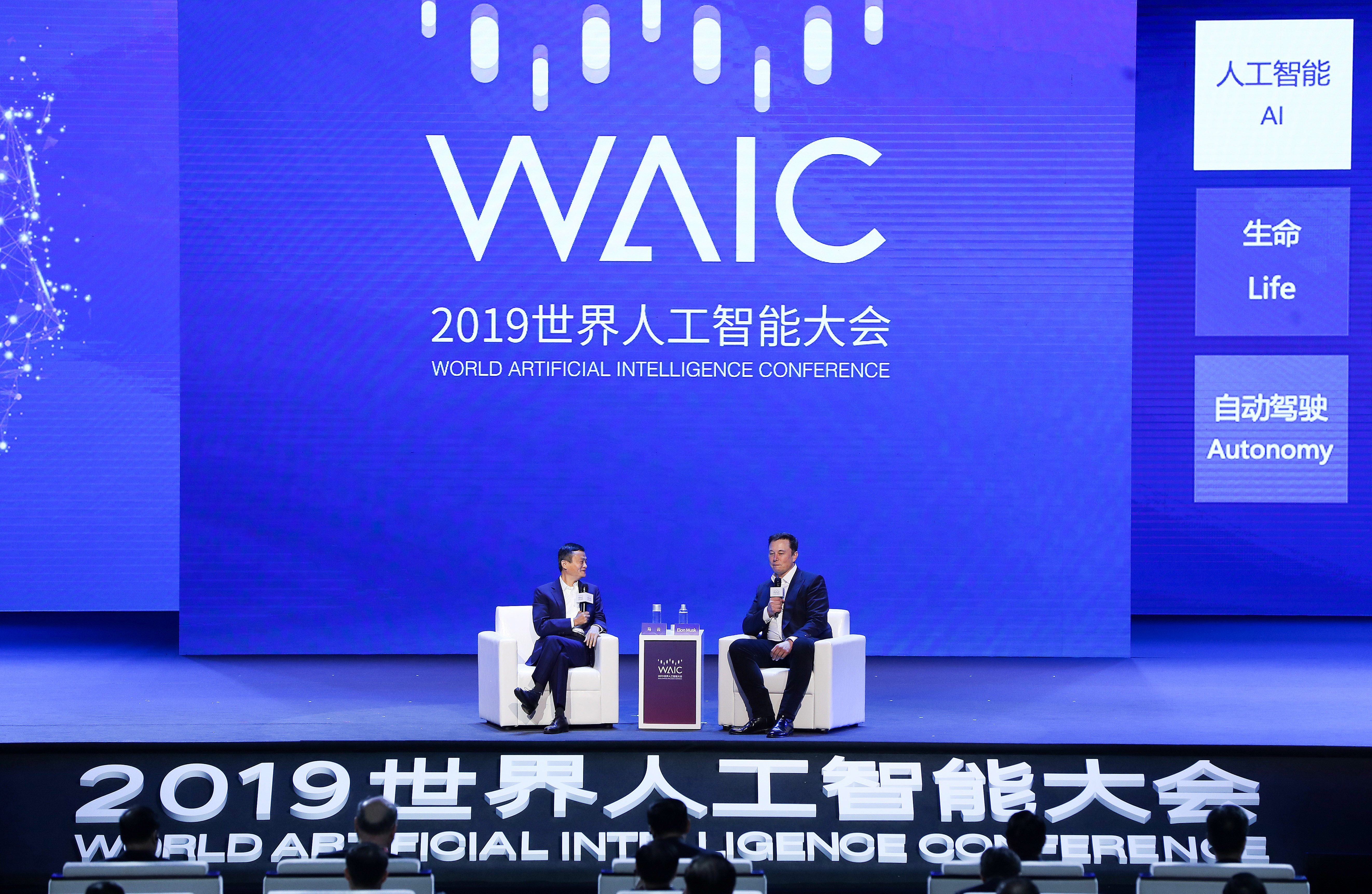 Jack Ma (L), executive chairman of e-commerce giant Alibaba, holds a dialogue with Elon Musk, CEO of U.S. electric carmaker Tesla Inc., at the opening ceremony of the 2019 World Artificial Intelligence Conference (WAIC) in east China's Shanghai. (Xinhua/Ding Ting)
