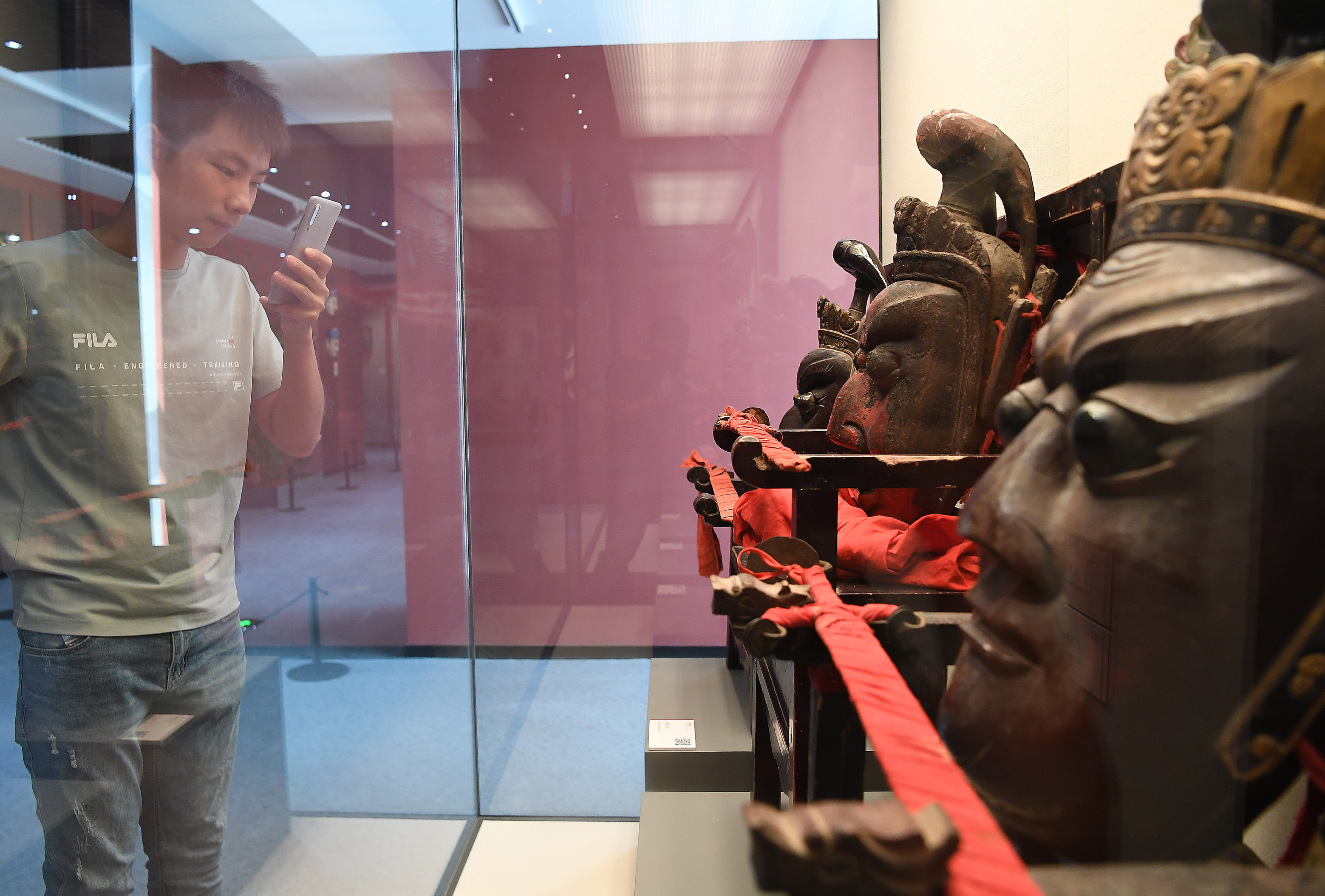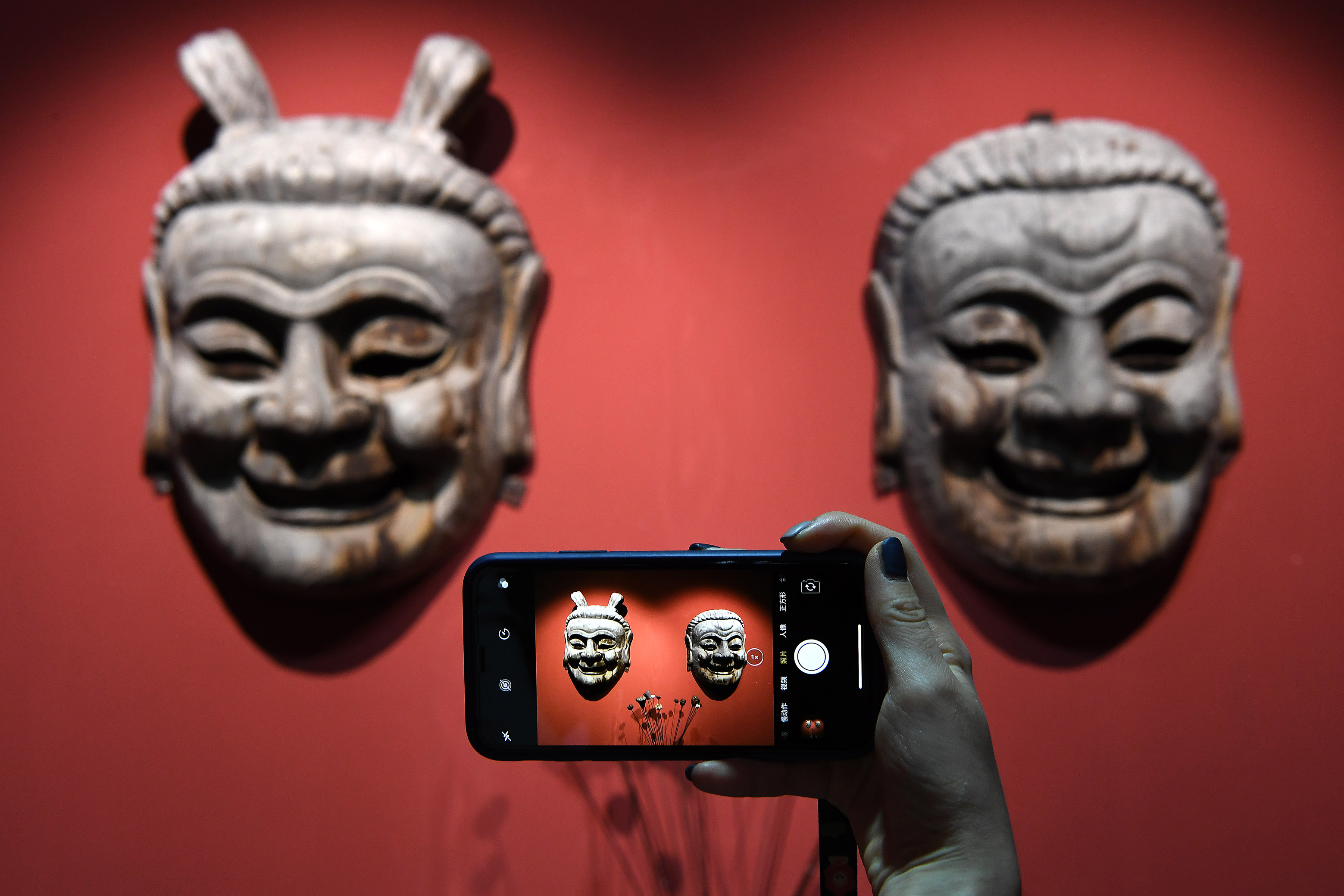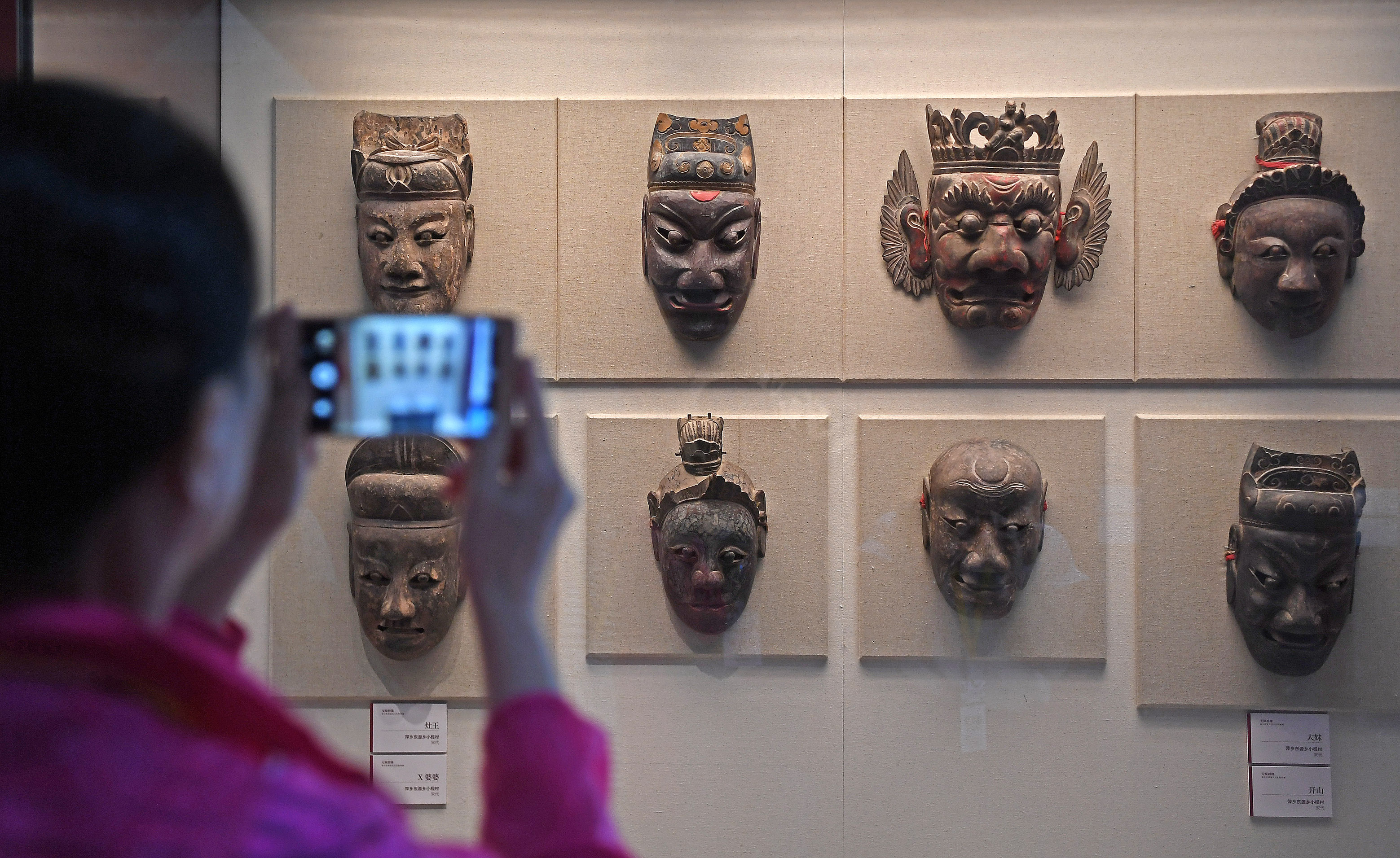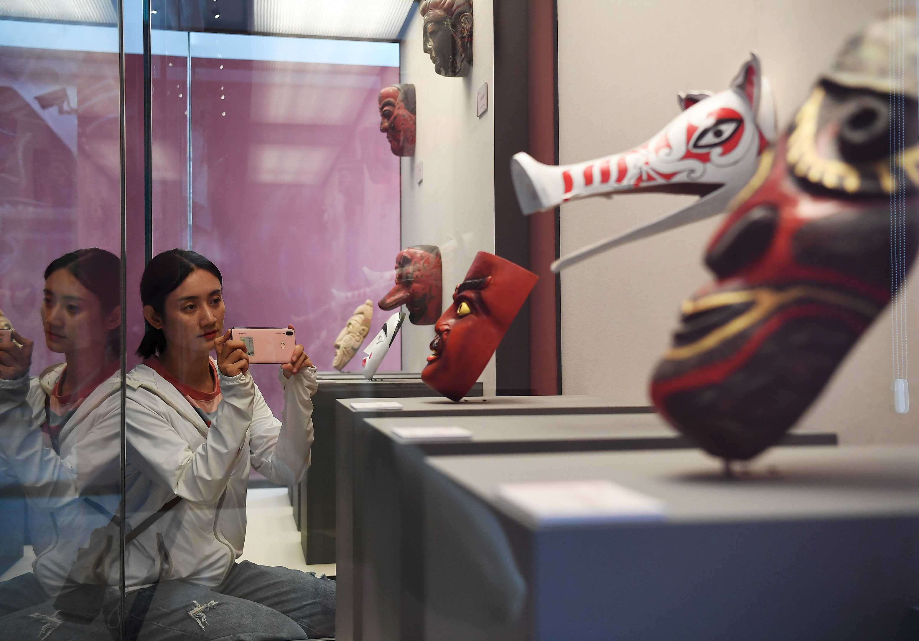 A visitor takes photos of mask exhibits during an exhibition in Nanfeng County, east China's Jiangxi Province, Sept. 27, 2019. (Xinhua/Wan Xiang)