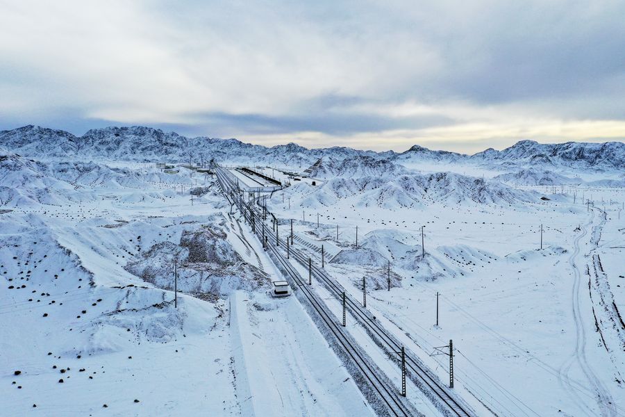 Aerial photo taken on Dec. 15, 2019 shows the tracks of the Dunhuang-Golmud railway near Saishiteng Mountain in northwest China. (Xinhua/Zhang Long)