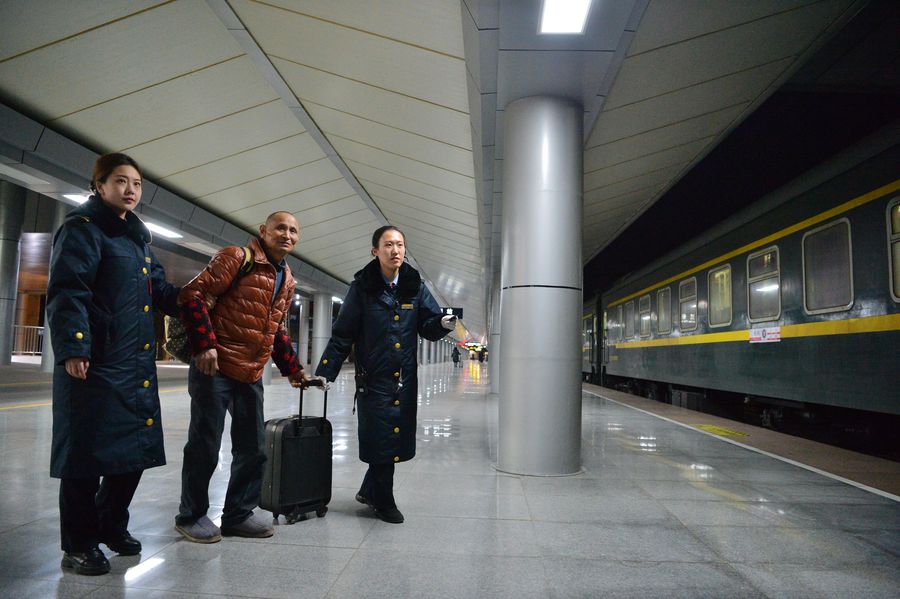 Yang Chenxue (R) and her colleague help an elder passenger who is traveling alone board the train in advance at Lanzhou Railway Station in Lanzhou, capital city of northwest China's Gansu Province, Jan. 5, 2020. (Xinhua/Ma Xiping)