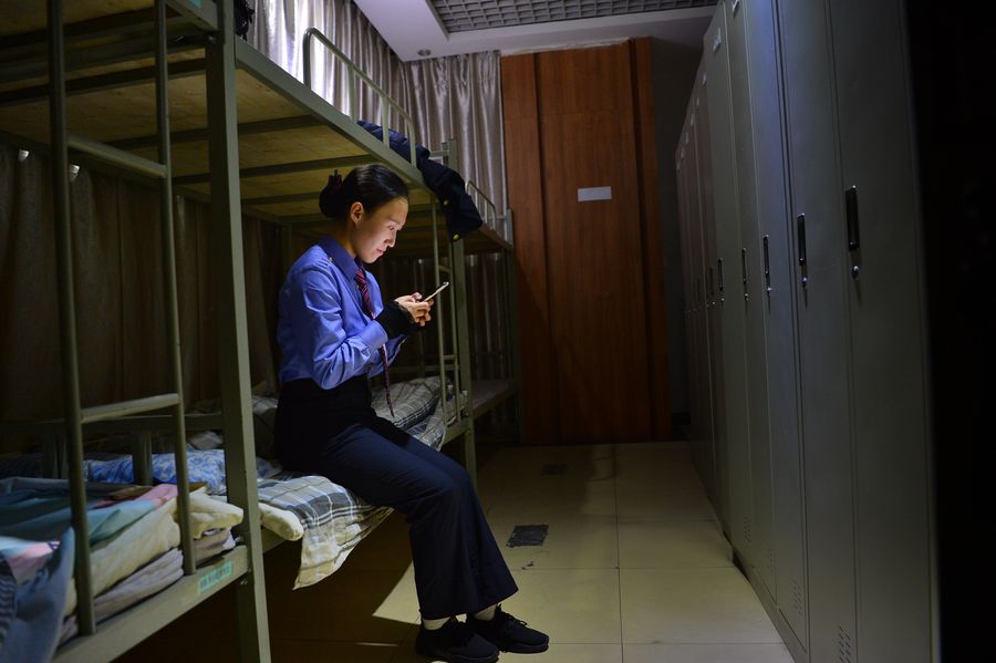 Yang Chenxue has a video chat with her parents after work in dormitory at Lanzhou Railway Station in Lanzhou, capital city of northwest China's Gansu Province, Jan. 5, 2020. (Xinhua/Ma Xiping)