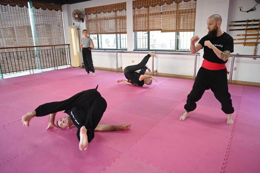 Neil Johnson (L, front) practices the Dishuquan with Chinese Kung Fu enthusiast Li Aming at a martial arts club in Fuzhou, southeast China's Fujian Province, Nov. 14, 2025.