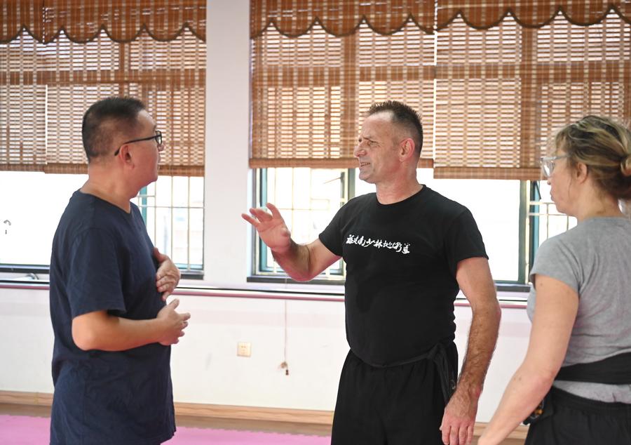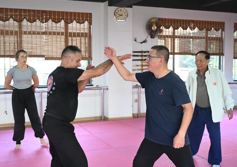 Neil Johnson (C) communictes with Chinese Kung Fu enthusiast Li Aming at a martial arts club in Fuzhou, southeast China's Fujian Province, Nov. 14, 2025. (Xinhua/Lin Shanchuan)