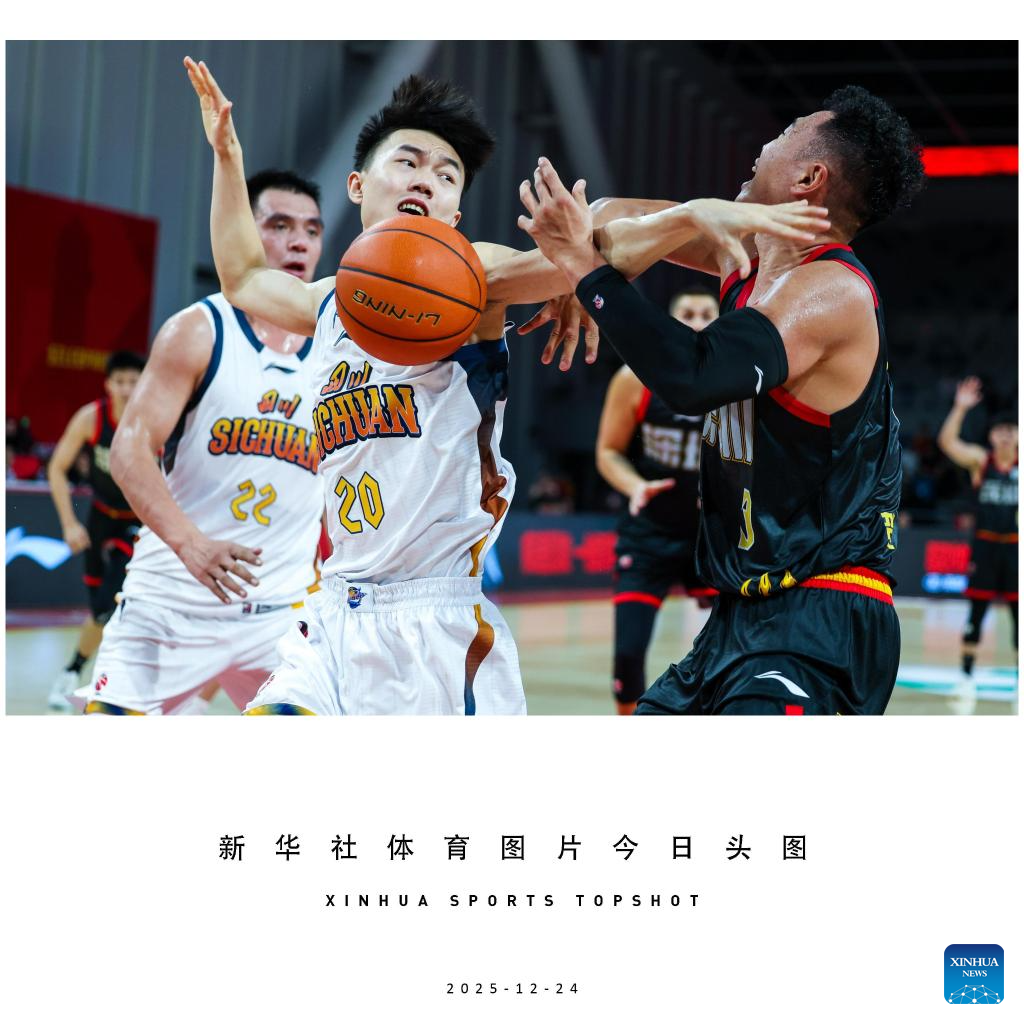 Zhang Gaoming (L) of Sichuan Blue Whales defends He Xining of Shenzhen Leopards during their 6th round match at the 2025-2026 season of the Chinese Basketball Association (CBA) league in Shenzhen, south China's Guangdong Province on Dec. 24, 2025. (Photo by Peng Zhigang/Xinhua)