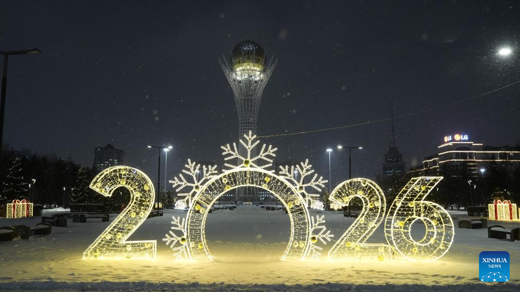New Year decorations are seen in front of the Baiterek Tower in Astana, Kazakhstan, Dec. 25, 2025. Astana has been adorned in festive decorations recently as the New Year approaches. (Photo by Kalizhan Ospanov/Xinhua)