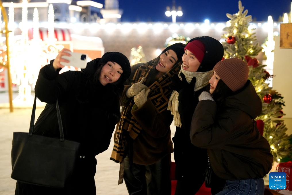 Local residents take selfies at a New Year-themed park at Independence Square in Astana, Kazakhstan, Dec. 26, 2025. Astana has been adorned in festive decorations recently as the New Year approaches. (Photo by Kalizhan Ospanov/Xinhua)