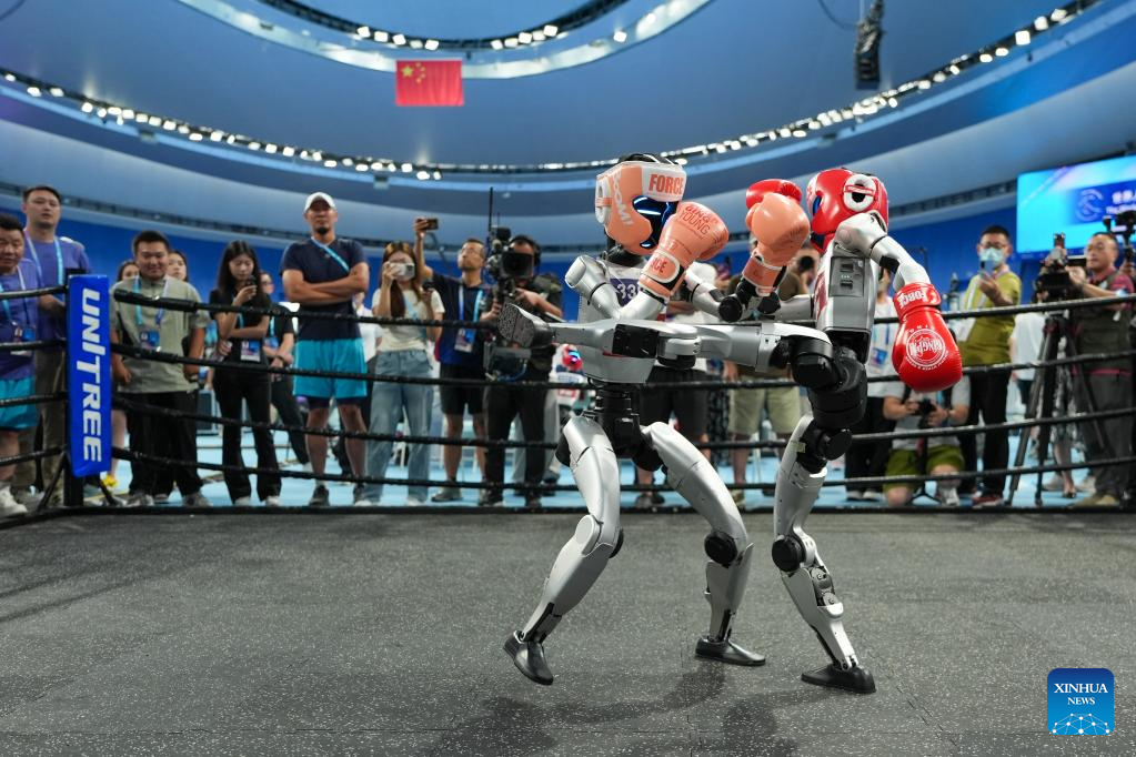 This file photo taken on Aug. 15, 2025 shows humanoid robots combating during a kickboxing match at the 2025 World Humanoid Robot Games in Beijing, capital of China. (Xinhua/Ju Huanzong)