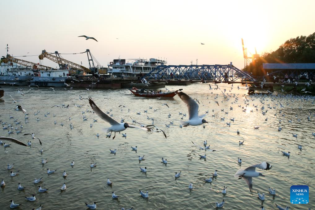 Seagulls are seen near a jetty along the Yangon River in Yangon, Myanmar, March. 23, 2026. (Xinhua/Myo Kyaw Soe)