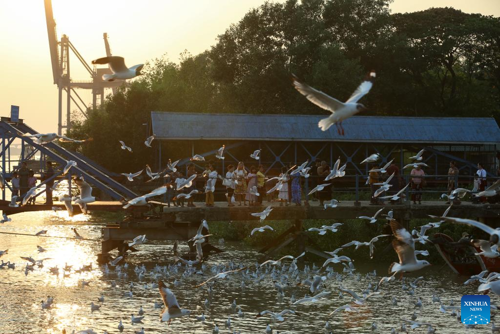 People feed seagulls near a jetty along the Yangon River in Yangon, Myanmar, March. 23, 2026. (Xinhua/Myo Kyaw Soe)