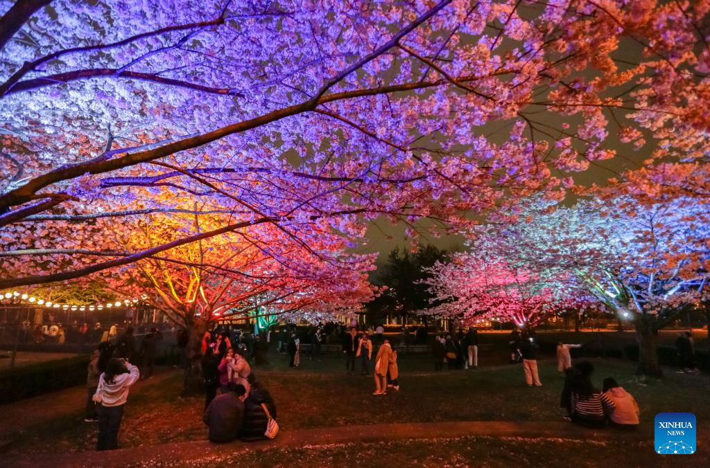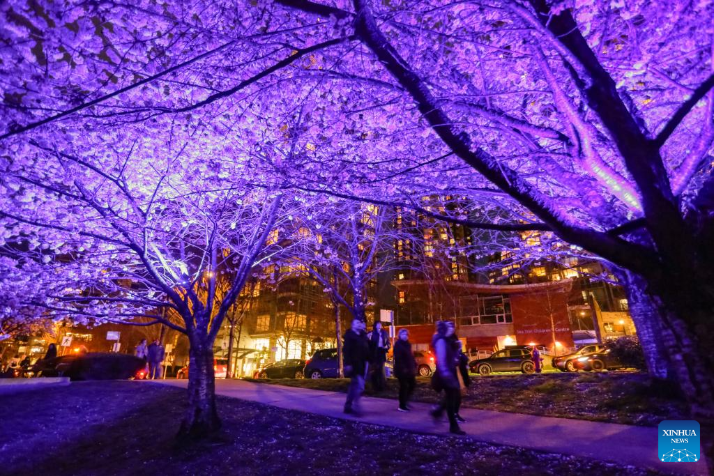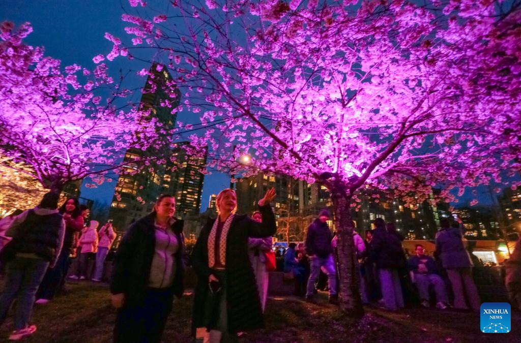 People view illuminated cherry blossom trees during the Blossoms After Dark event at David Lam Park in Vancouver, British Columbia, Canada, on March 27, 2026. The two-night free outdoor event features illuminated cherry blossoms, performances, food vendors and interactive activities. (Photo by Liang Sen/Xinhua)