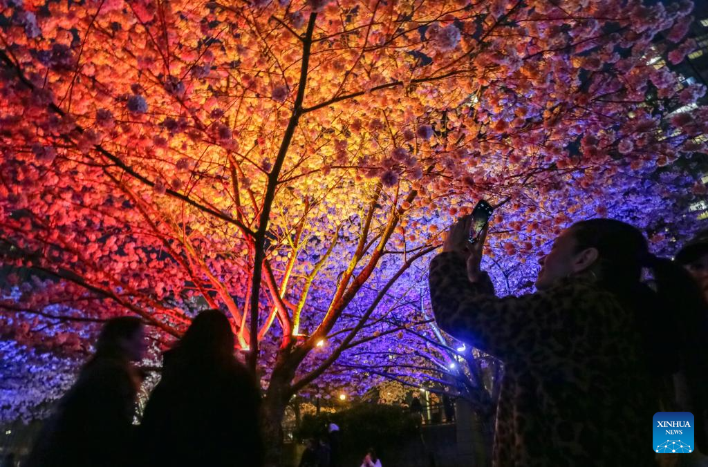 Visitors take photos under illuminated cherry blossom trees during the Blossoms After Dark event at David Lam Park in Vancouver, British Columbia, Canada, on March 27, 2026. The two-night free outdoor event features illuminated cherry blossoms, performances, food vendors and interactive activities. (Photo by Liang Sen/Xinhua)