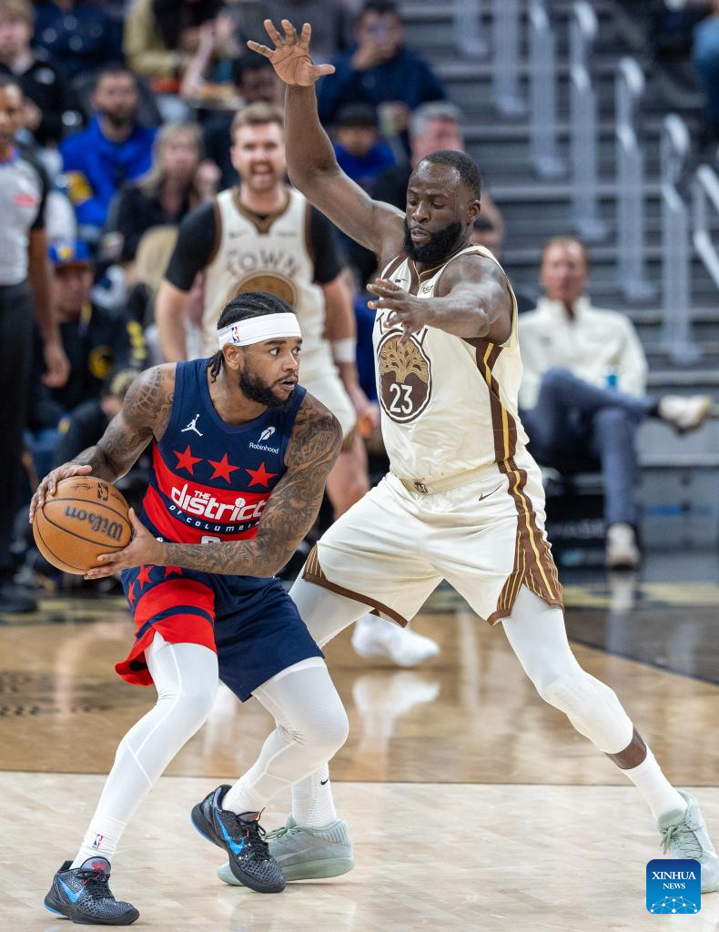 Draymond Green (R) of Golden State Warriors defends Jaden Hardy of Washington Wizards during the 2025-2026 NBA regular season basketball game between Washington Wizards and Golden State Warriors in San Francisco, the United States, March 27, 2026. (Photo by Arthur Dong/Xinhua)