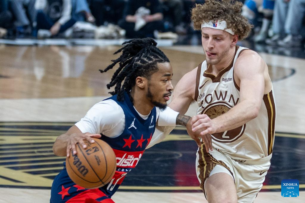 Gui Santos (R) of Golden State Warriors breaks through during the 2025-2026 NBA regular season basketball game between Washington Wizards and Golden State Warriors in San Francisco, the United States, March 27, 2026. (Photo by Arthur Dong/Xinhua)