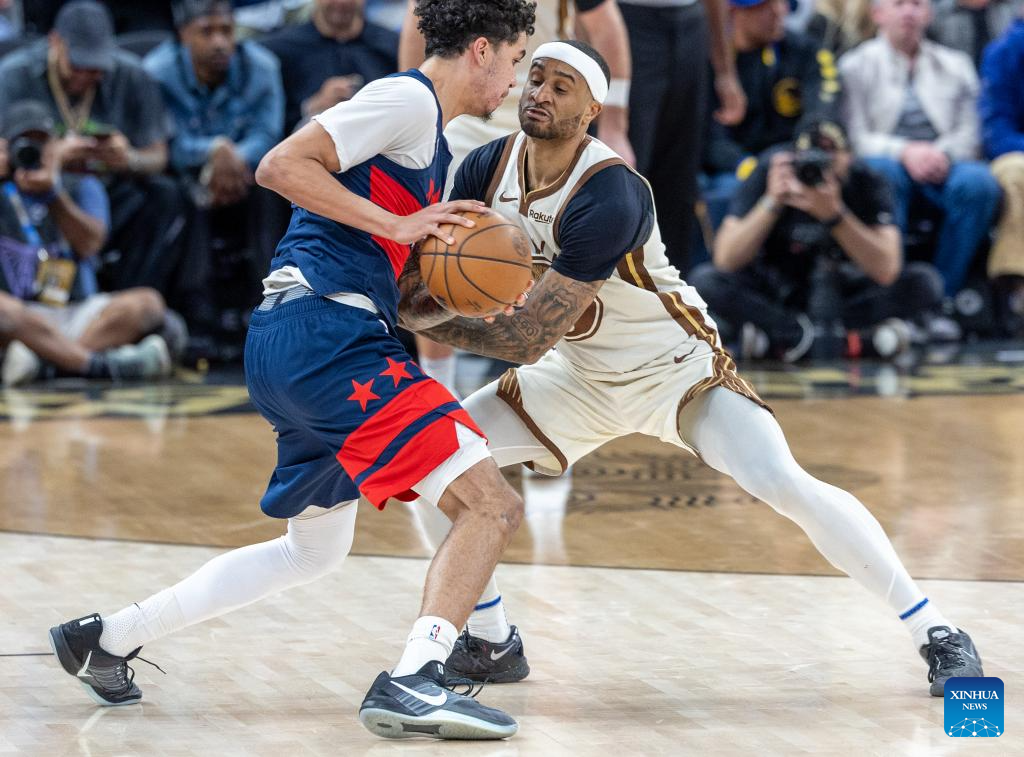 Gary Payton II (R) of Golden State Warriors defends Will Riley of Washington Wizards during the 2025-2026 NBA regular season basketball game between Washington Wizards and Golden State Warriors in San Francisco, the United States, March 27, 2026. (Photo by Arthur Dong/Xinhua)