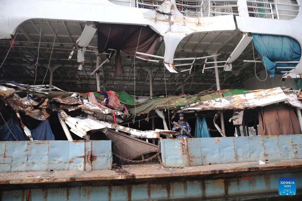 This photo taken on Dec. 26, 2025 shows a damaged ferry after a collision in Dhaka, capital of Bangladesh. (Photo by Habibur Rahman/Xinhua)
