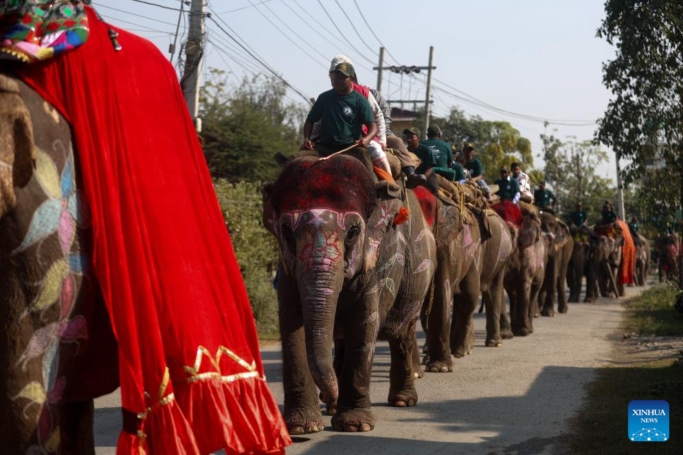 Nepalese women dressed in traditional attire participate in a rally during the 19th Elephant and Tourism Festival in Chitwan, Nepal, Dec. 26, 2025. The event aims to bring human closer with elephants, encourage wildlife protection and conservation, and promote tourism in the region. (Photo by Sulav Shrestha/Xinhua)