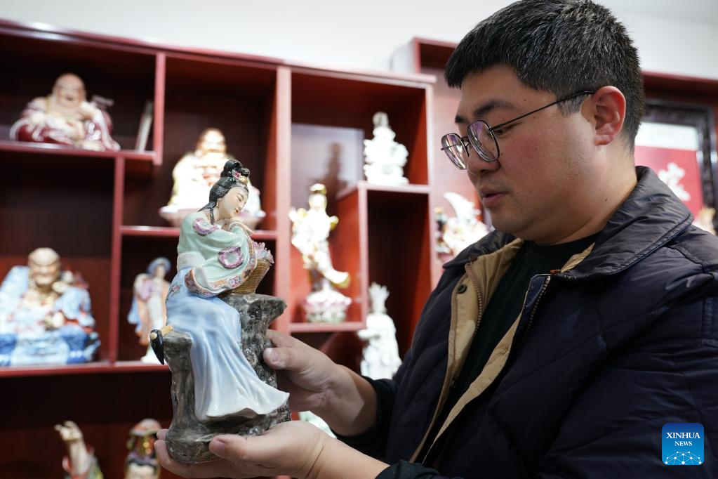 Zeng Rui displays porcelain sculpture made by his family predecessors at his studio in Jingdezhen, east China's Jiangxi Province, March 12, 2026.(Xinhua/Zhou Mi)