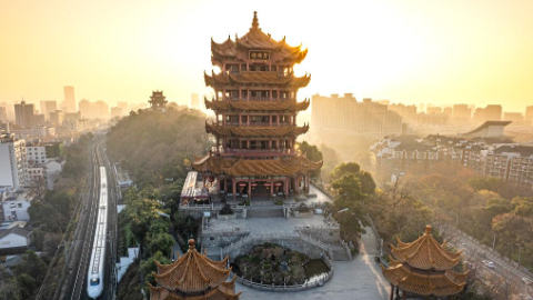 Scenery of Yellow Crane Tower at sunrise in Wuhan, China's Hubei