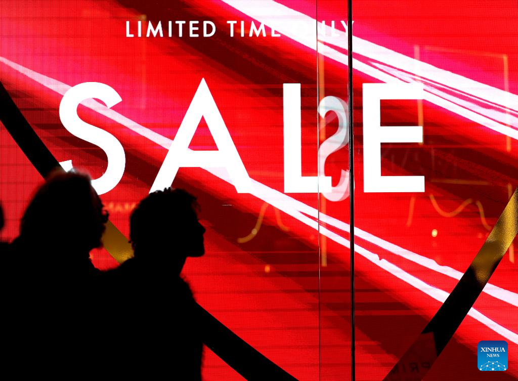 People walk past a sale sign on Oxford Street during Boxing Day sales in London, Britain, on Dec. 26, 2025. (Xinhua/Li Ying)