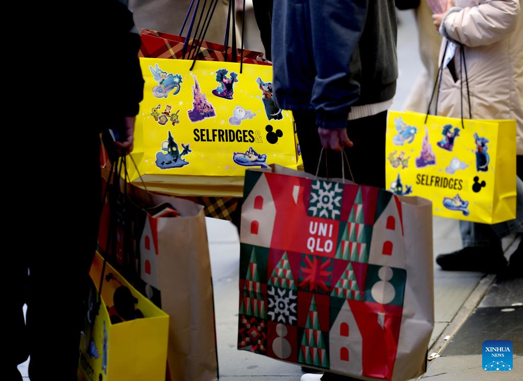 A shopper is seen with his bags on Oxford Street during Boxing Day sales in London, Britain, on Dec. 26, 2025. (Xinhua/Li Ying)