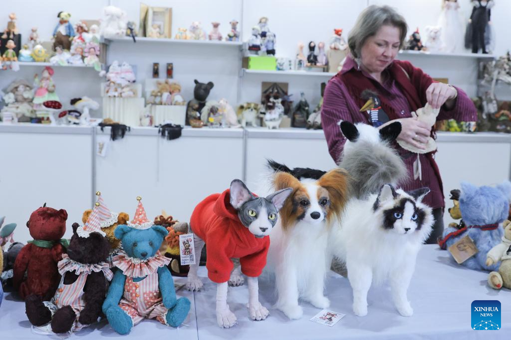 This photo taken on March 27, 2026 shows dolls on display at a dolls exhibition in St. Petersburg, Russia. St. Petersburg hosts an exhibition of exquisite dolls from March 27 to 29, attracting more than 300 craftspeople who showcase thousands of their works. (Photo by Irina Motina/Xinhua)