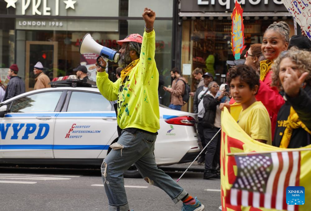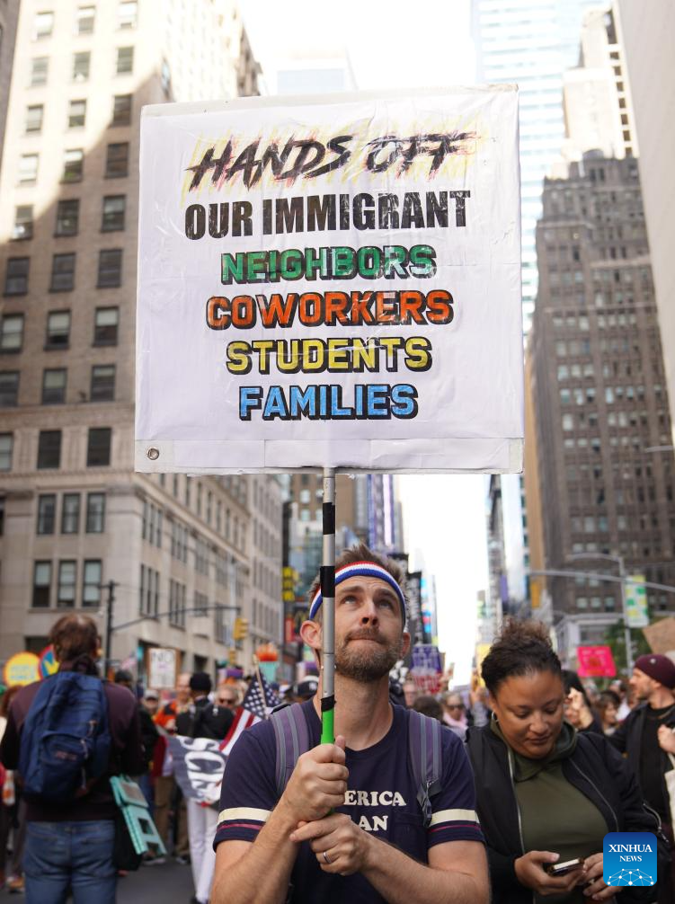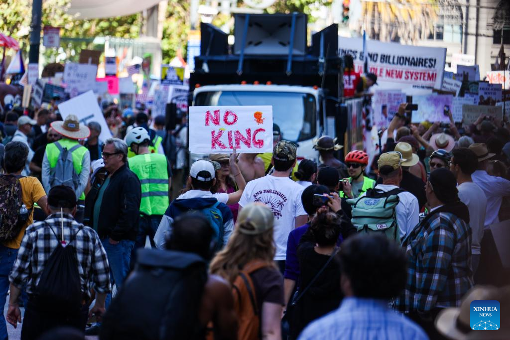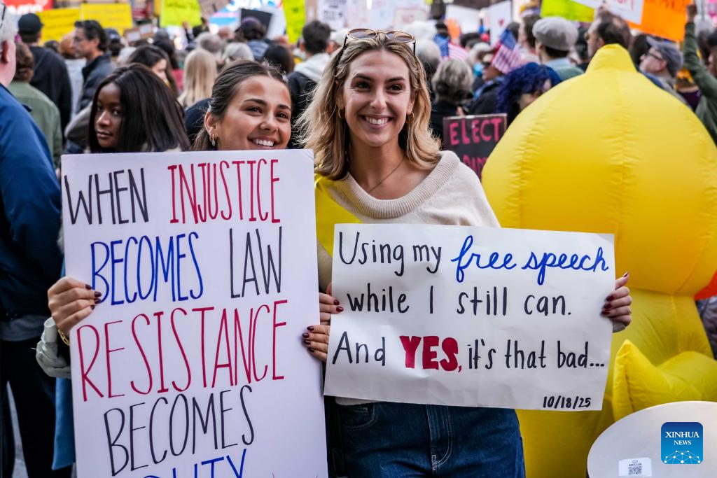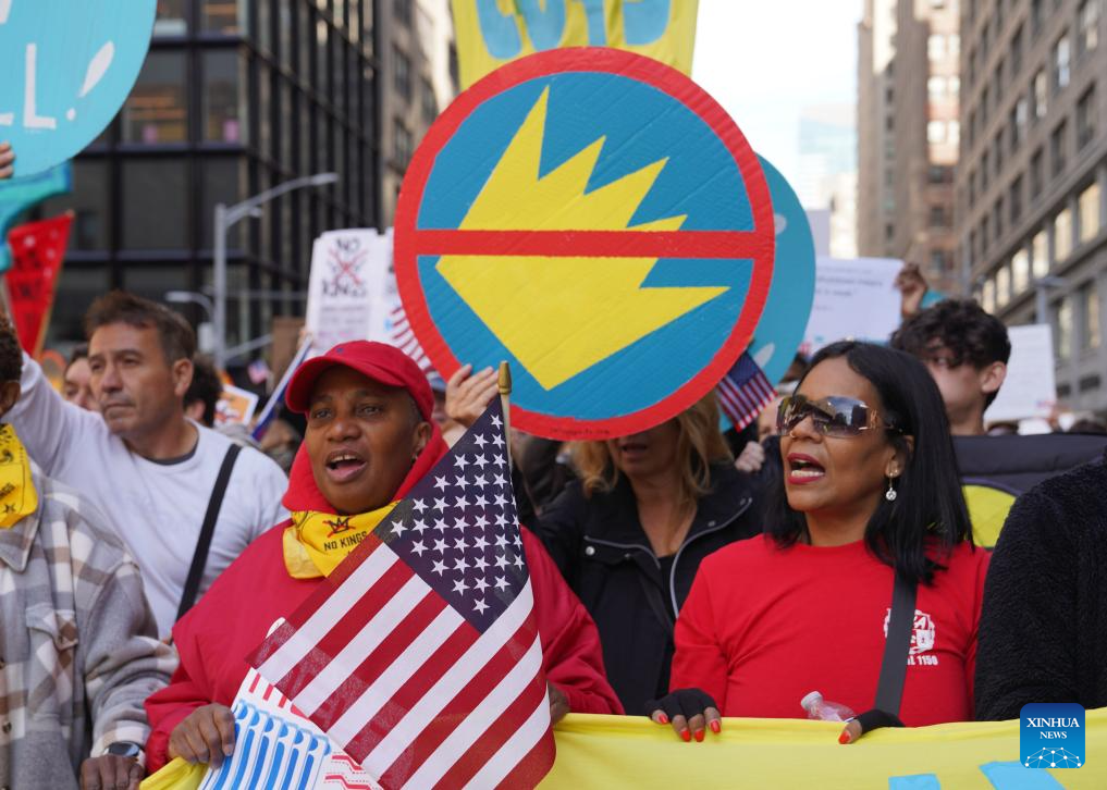 NEW YORK/SAN FRANCISCO, Oct. 18 (Xinhua) -- Tens of thousands of people took to the streets across 2,700 U.S. cities and towns on Saturday for the second round of the nationwide "No Kings" protests, the largest single-day demonstration in American history.