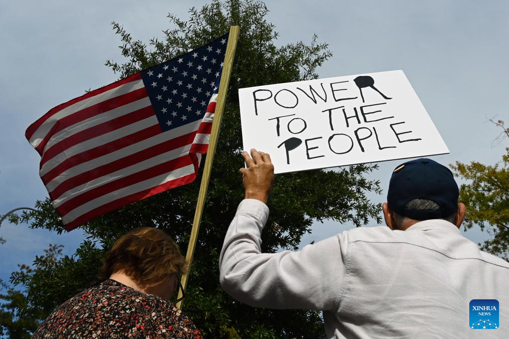 Following the first nationwide "No Kings" protest on June 14, this round of rallies, spanning all 50 states, came as the federal government shutdown entered its 18th day with no resolution in sight. (Xinhua/Zhang Fengguo)