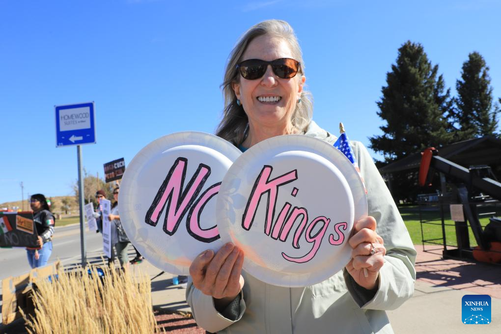 A woman takes part in a "No Kings" protest in Rock Springs, Wyoming, the United States, on Oct. 18, 2025. Tens of thousands of people took to the streets across 2,700 U.S. cities and towns on Saturday for the second round of the nationwide "No Kings" protests, the largest single-day demonstration in American history.