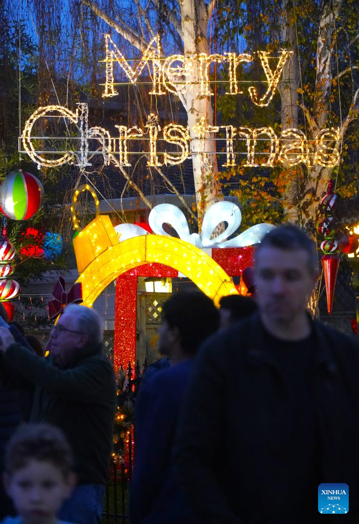 People look at Christmas decorations on the Eucalyptus Avenue of San Carlos in San Francisco Bay Area of California, the United States, Dec. 24, 2025. (Xinhua/Wu Xiaoling)