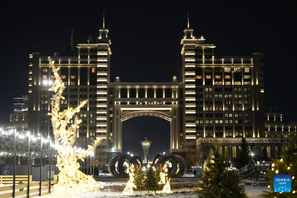 New Year-themed decorations are displayed in front of a landmark building in Astana, Kazakhstan, Dec. 25, 2025. Astana has been adorned in festive decorations recently as the New Year approaches. (Photo by Kalizhan Ospanov/Xinhua)