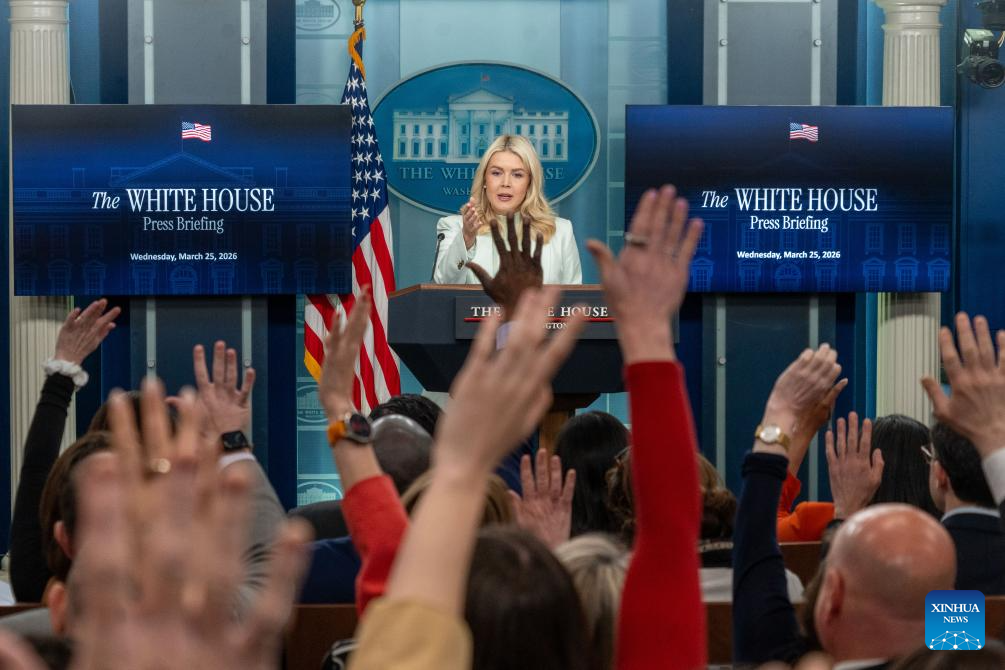 White House Press Secretary Karoline Leavitt speaks at a White House press briefing in Washington, D.C., the United States, March 25, 2026. U.S. President Donald Trump will "unleash hell" if Iran refuses to make a deal over the ongoing U.S.-Israeli war against Iran, White House Press Secretary Karoline Leavitt said on Wednesday. (Photo by Li Yuanqing/Xinhua)