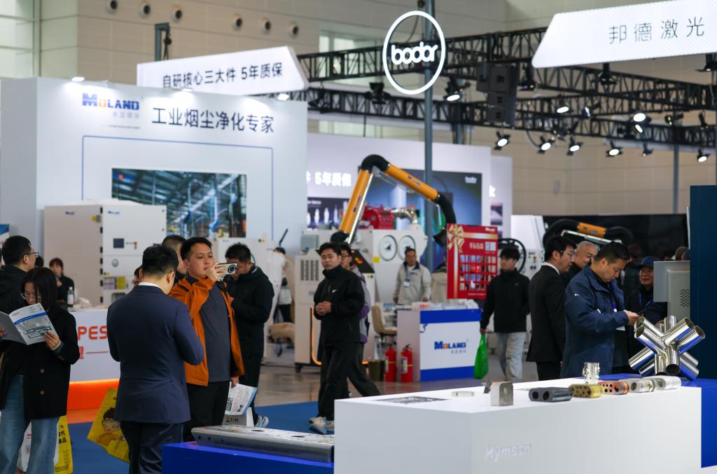 3月18日,参展商向观众讲解一款折弯机设备。
