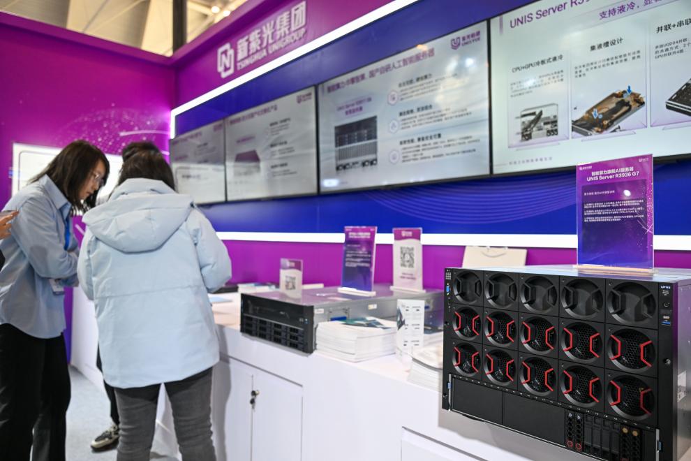 3月18日,观众在天津工博会上参观算力服务器。
