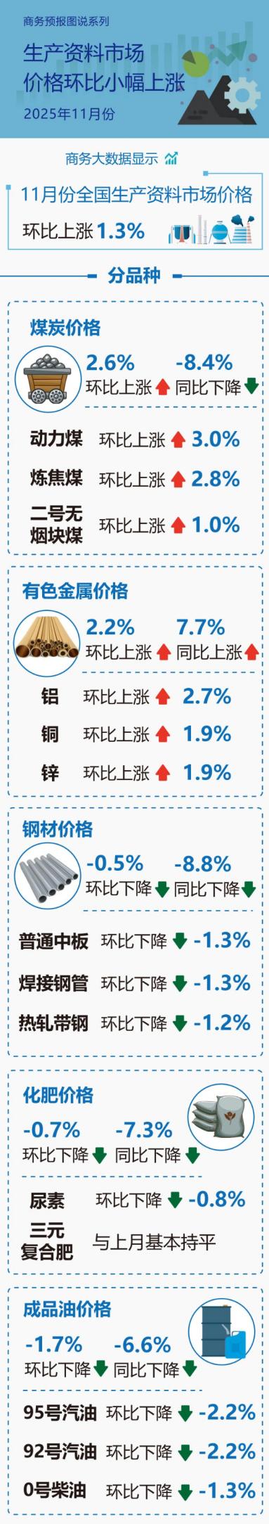 商务大数据显示,11月份全国生产资料市场价格环比上涨1.3%。