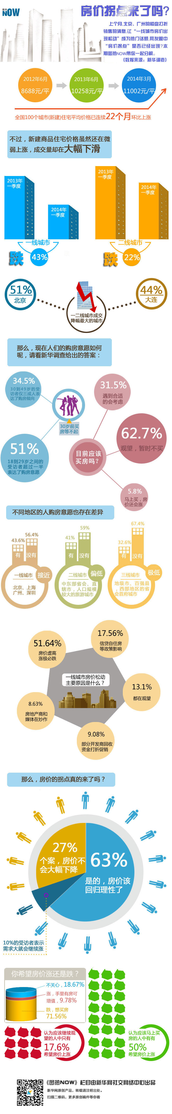 4月1日,中指院發(fā)布2014年3月中國房地產(chǎn)指數(shù)系統(tǒng)百城價格指數(shù)報告,在房價漲幅趨緩的同時,成交量也大幅下滑,上個月,北京、廣州的樓盤打折銷售的消息,讓“一線城市房價出現(xiàn)松動”成為熱門話題,“新華調查”欄目推出了“一線城市房價是否到了拐點?”的專題調查,那么,網(wǎng)友眼中“房價拐點”是否已經(jīng)出現(xiàn)?本期圖熱NOW帶你一起分解。