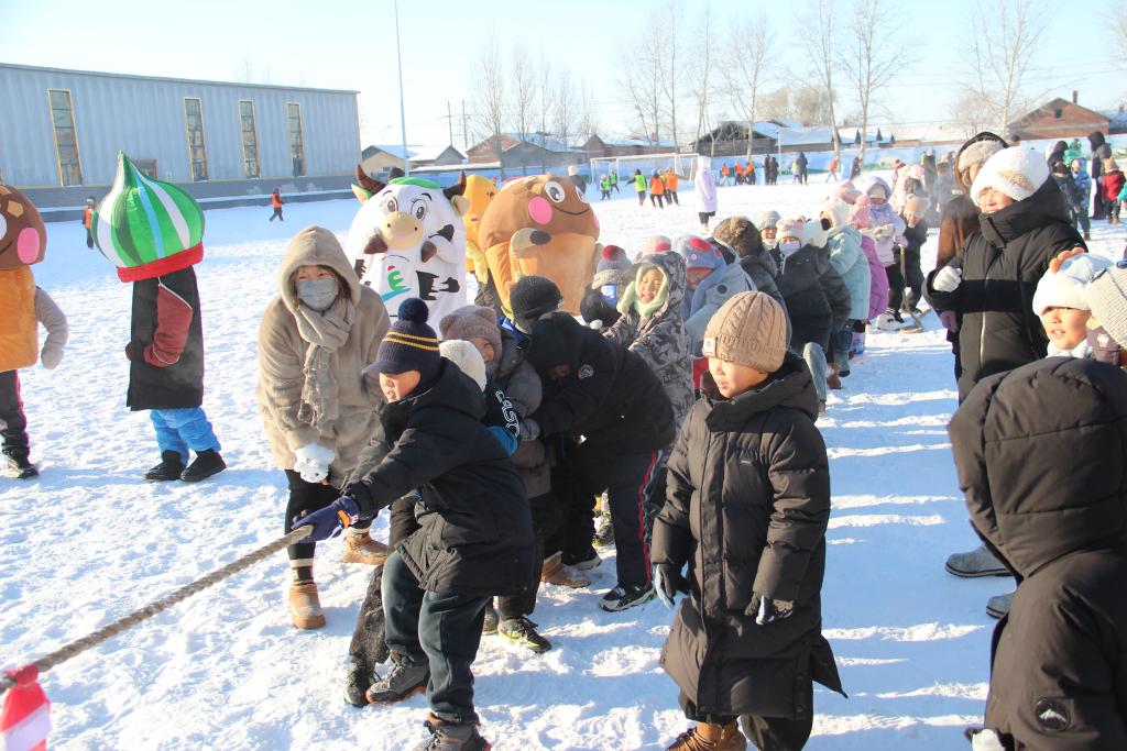 额尔古纳市第三小学的学生在进行雪地拔河比赛。