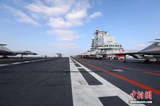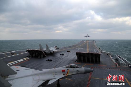 資料圖:2016年12月23日,在黃海某??沼颍嗯螝?15艦載戰(zhàn)斗機從遼寧艦飛行甲板起飛升空,開展了空中加受油、空中對抗等多項訓(xùn)練任務(wù)。 中新社發(fā) 莫小亮 攝