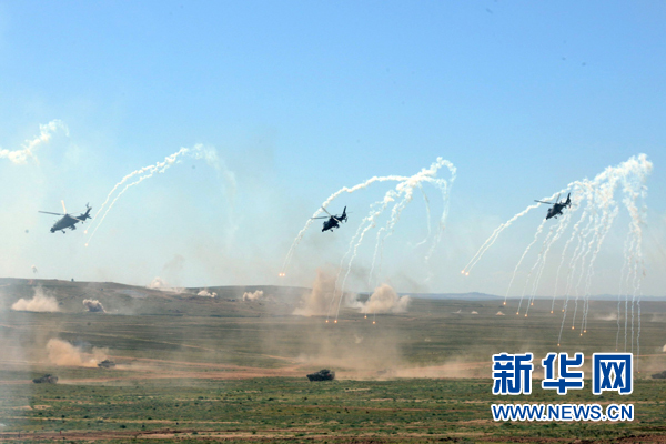“和平使命-2014”聯(lián)合軍演中,原陸軍第38集團(tuán)軍某紅軍團(tuán)突擊分隊在陸航掩護(hù)下沖擊目標(biāo)陣地 (2014年8月26日攝)。新華社發(fā)