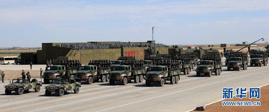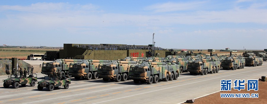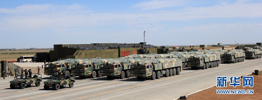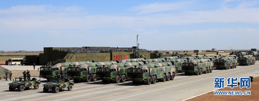 7月30日,慶祝中國人民解放軍建軍90周年閱兵在位于內(nèi)蒙古的朱日和訓練基地舉行。中共中央總書記、國家主席、中央軍委主席習近平檢閱部隊并發(fā)表重要講話。這是核常兼?zhèn)鋵椃疥牎P氯A社記者 查春明 攝