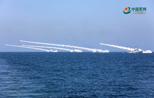 8月7日,海軍在黃海、渤海相關(guān)??沼蚪M織實(shí)兵實(shí)彈對抗演習(xí),最大限度檢驗(yàn)體系作戰(zhàn)能力、戰(zhàn)法訓(xùn)法、武器裝備效能,共實(shí)射各型導(dǎo)彈數(shù)十枚。這是水面艦艇齊射反艦導(dǎo)彈。李唐 攝(圖片來源:中國軍網(wǎng))